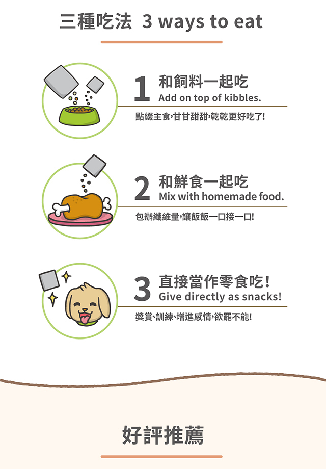◆ 輕鬆簡單又好吃,訓練、零食,直接吃或加在主食中都一口接一口!