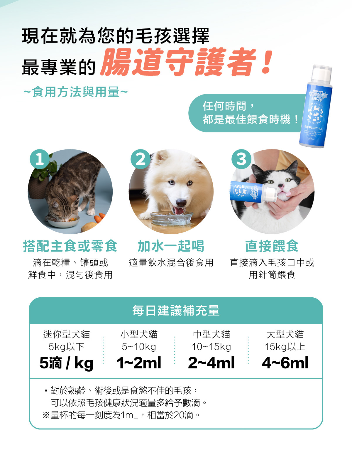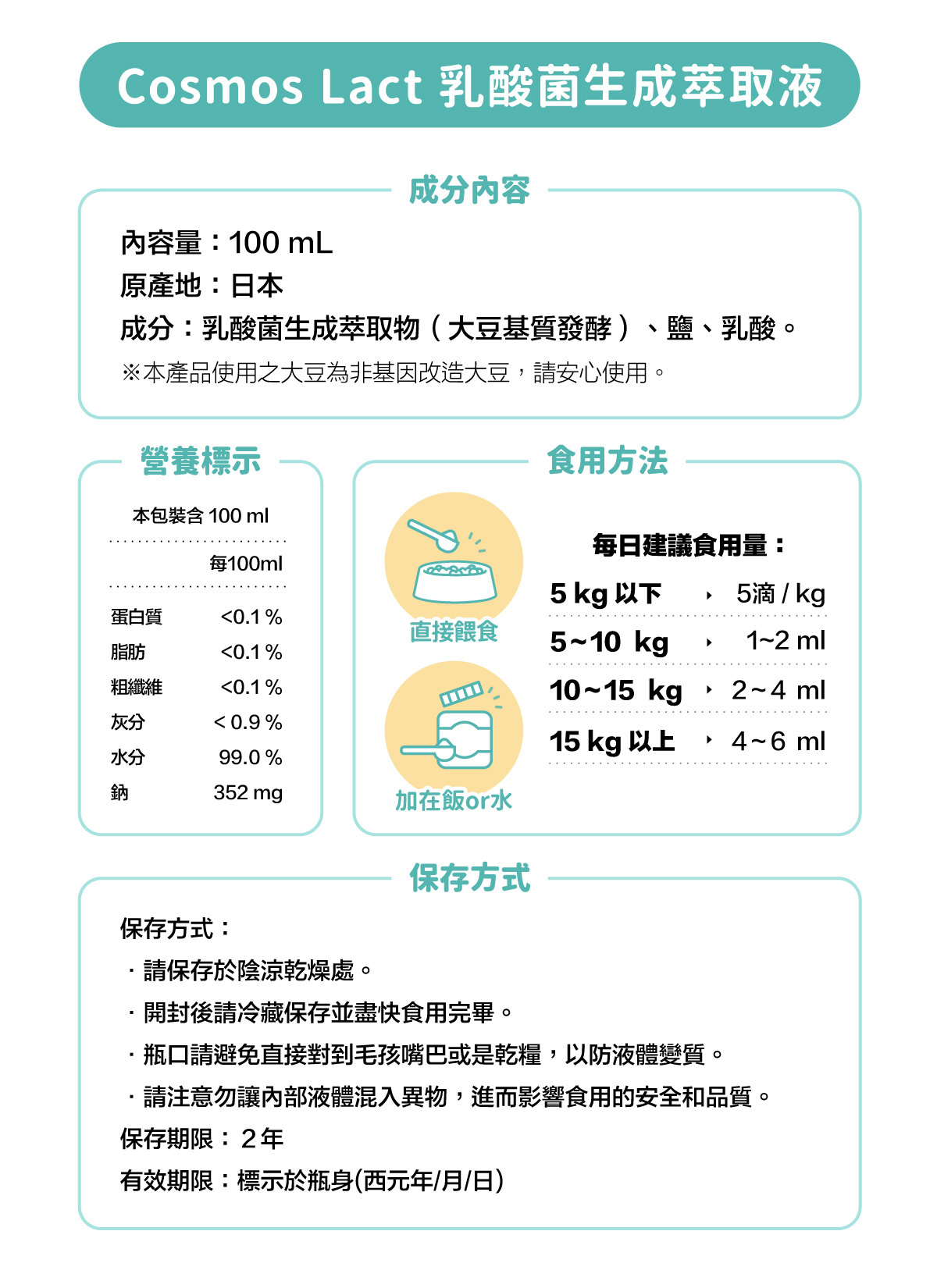 【保存方式】:請置於陰涼乾燥處,開封後請冷藏保存並盡快食用完畢。請避免瓶口直接接觸毛孩的嘴巴或乾糧,避免異物混入瓶內,導致變質。