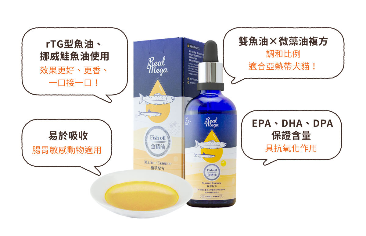 1. 使用三種油複方:雙魚油+國立臺灣大學技轉藻油,提供充足EPA+DHA基底,調和比例適合亞熱帶犬貓。