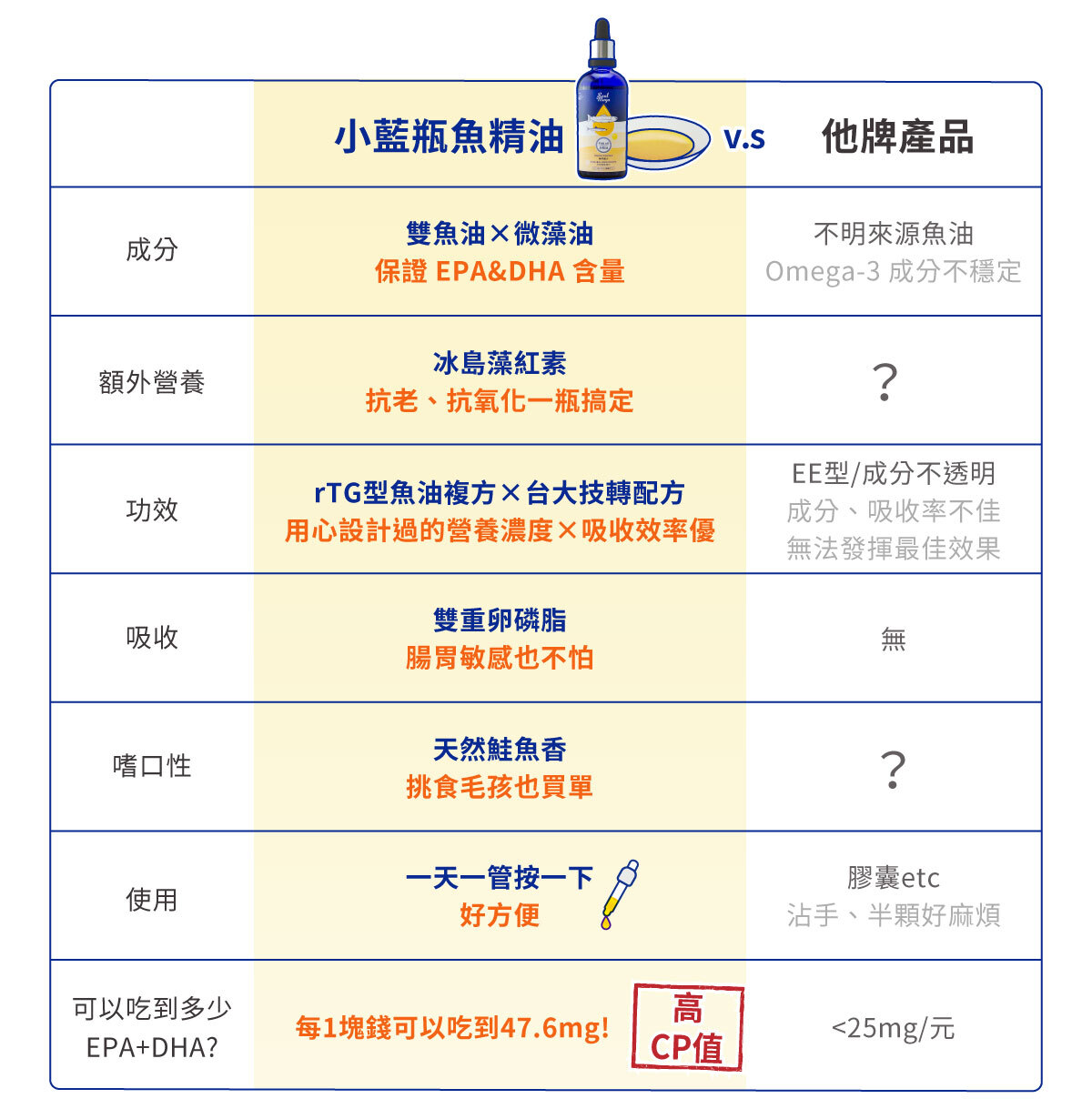 4. 卵磷脂是天然乳化劑,可以幫助乳化脂肪、更經過實驗證實可以幫助脂肪吸收。 #小藍瓶魚精油 除了一般的大豆卵磷脂外,另加入了「微分子減脂卵磷脂」。「微分子減脂卵磷脂」可以讓油脂在腸道乳糜化的效果更好,營養不浪費!