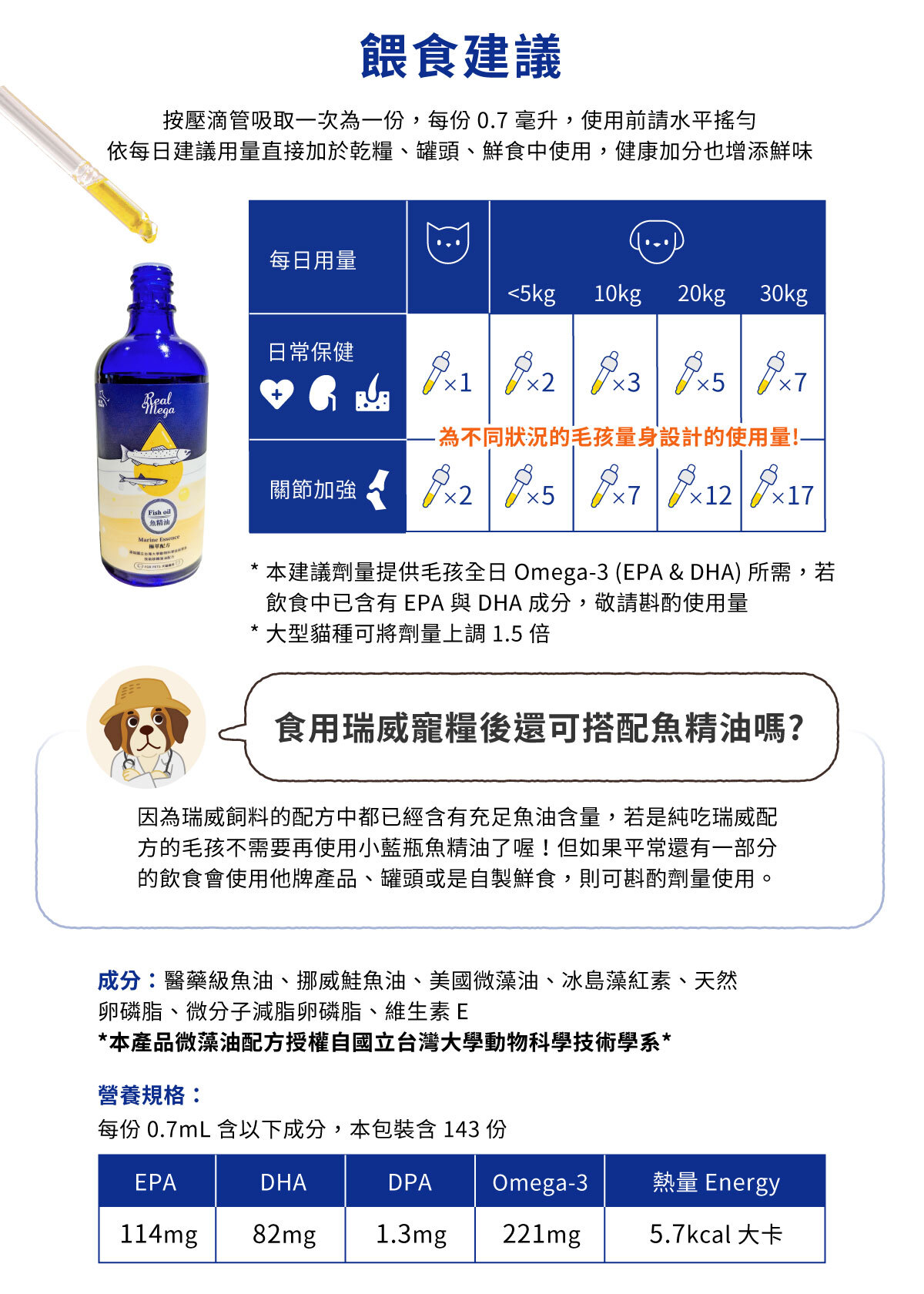 A. 因為瑞威飼料的配方中都已經含有充足魚油含量,若是純吃瑞威配方的毛孩不需要再使用小藍瓶魚精油了喔!但如果平常還有一部分的飲食會使用他牌產品、罐頭或是自製鮮食,則可以斟酌劑量使用。如有特殊狀況歡迎私訊官方臉書或官方LINE。